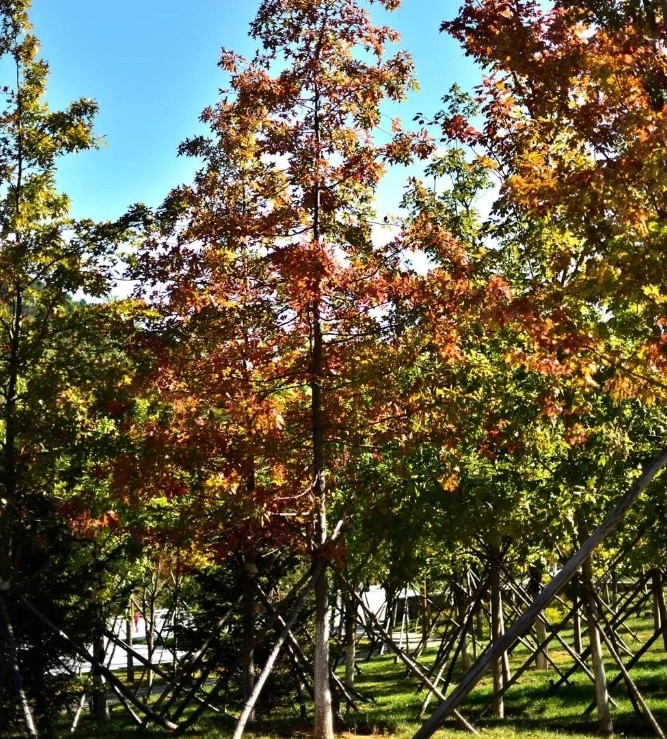 糖心啪啪啪视频红针栎金字塔树形,树干挺拔,冠形生长极具特点:向上枝条,横向枝条,下垂枝条,枝条分布均匀,层次分明,彰显帝王风范。耐寒易养护、适应能力强、移栽成活率高。冬季景观独树一帜,在沈阳以南地区均可栽植。
