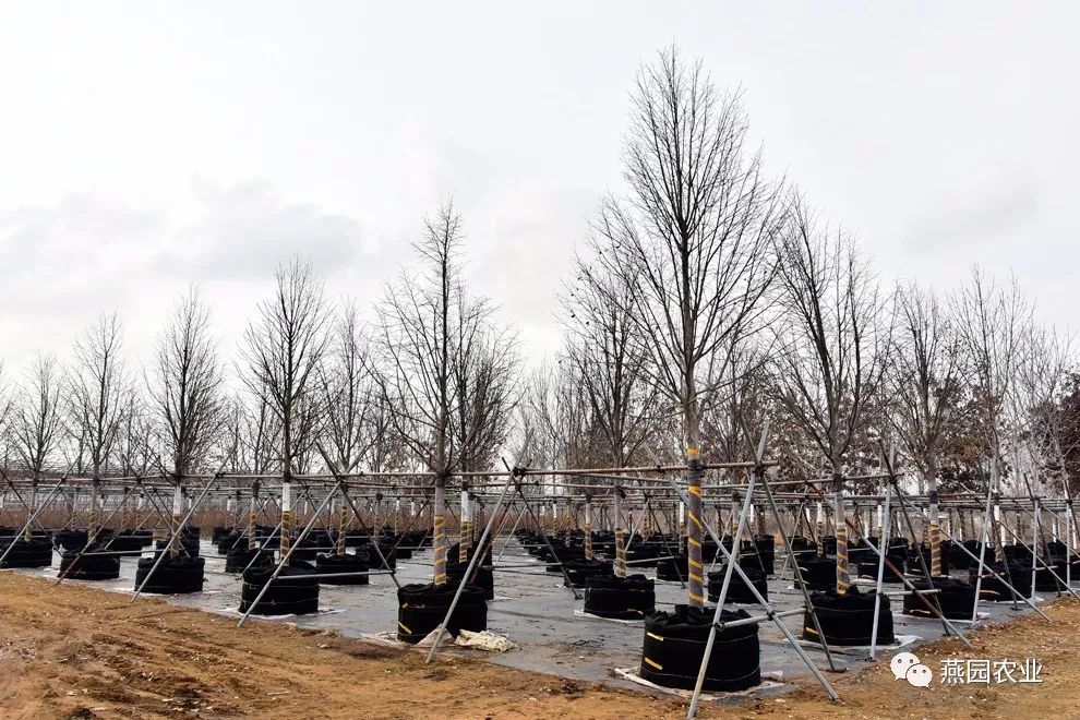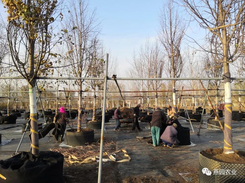 冬季在控根育苗器外部及苗木树干处加裹毡布,为苗木做好保暖防寒工作。