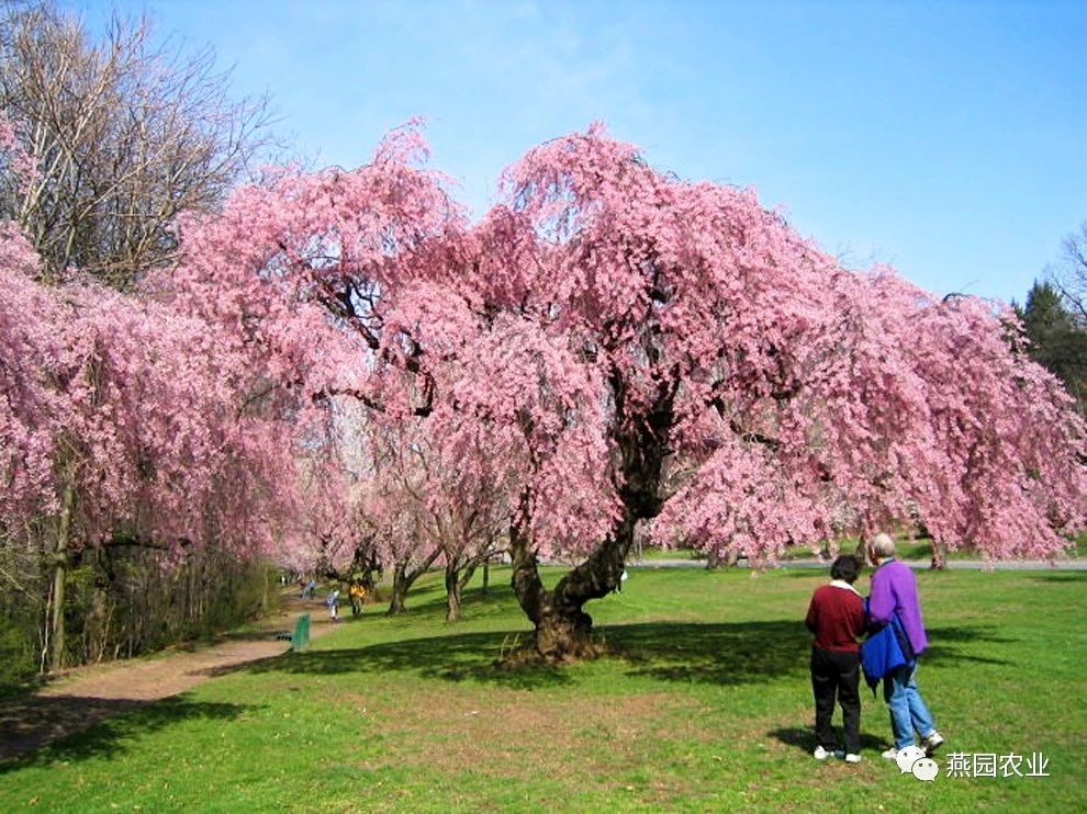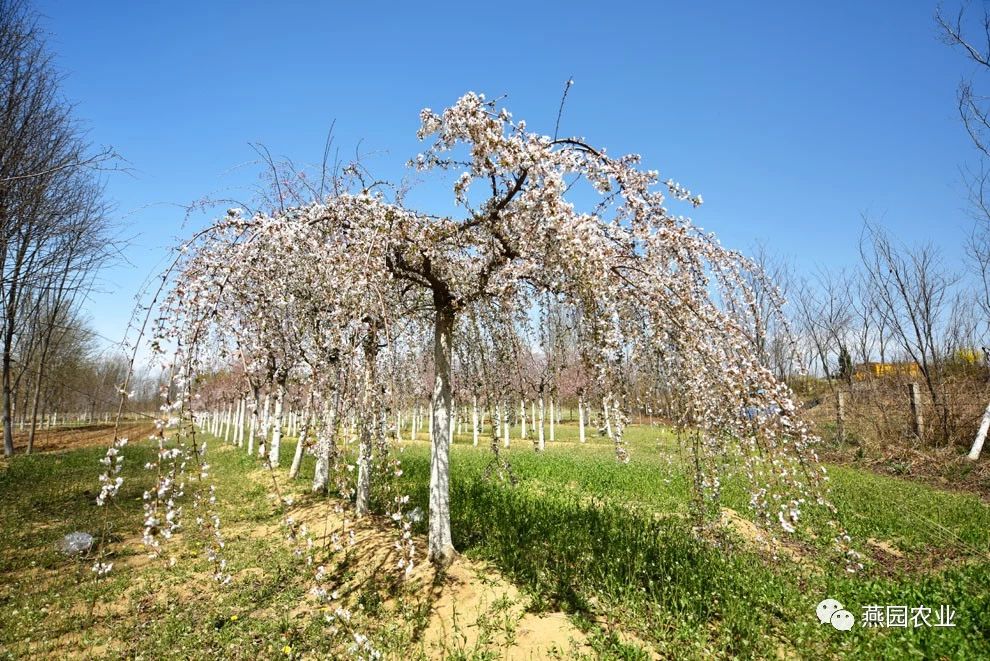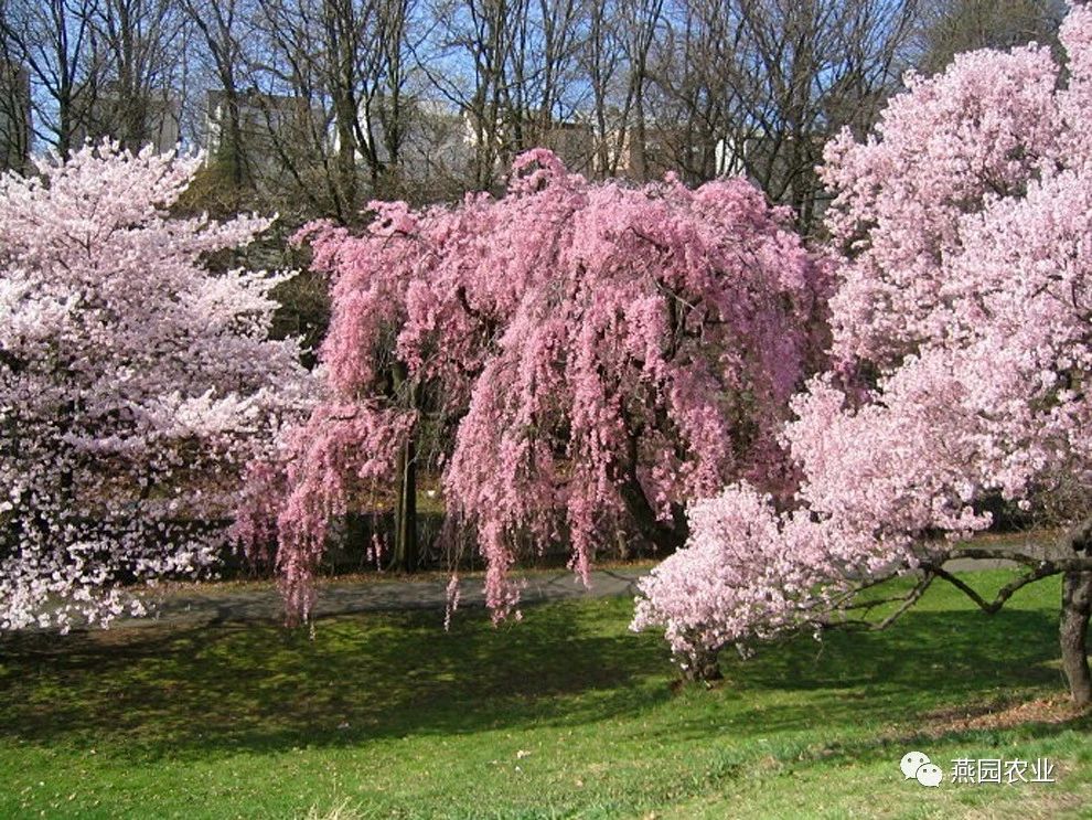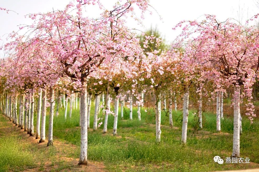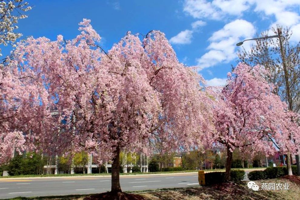 樱花起源于中国,距今已有2000多年的栽培历史,由盛唐时期传至东瀛,而后发扬光大备受欢迎。垂枝樱花花期为4月中下旬,花色鲜艳亮丽,枝叶繁茂旺盛,花先叶开放,着花繁密,花色粉红或雪白,是早春重要的观花树种,被广泛用于园林观赏。经园艺工作者多年选育,垂枝樱花表现最佳,可孤植或群植于庭院、公园、草坪、湖边或居住小区等,也可列植或和其他花灌木合理配置于市政、园林道路两旁或片植作专类园。因此垂枝樱花是各类观光园、景区彩化、高校美化、市政行道等常用观花彩叶树种。