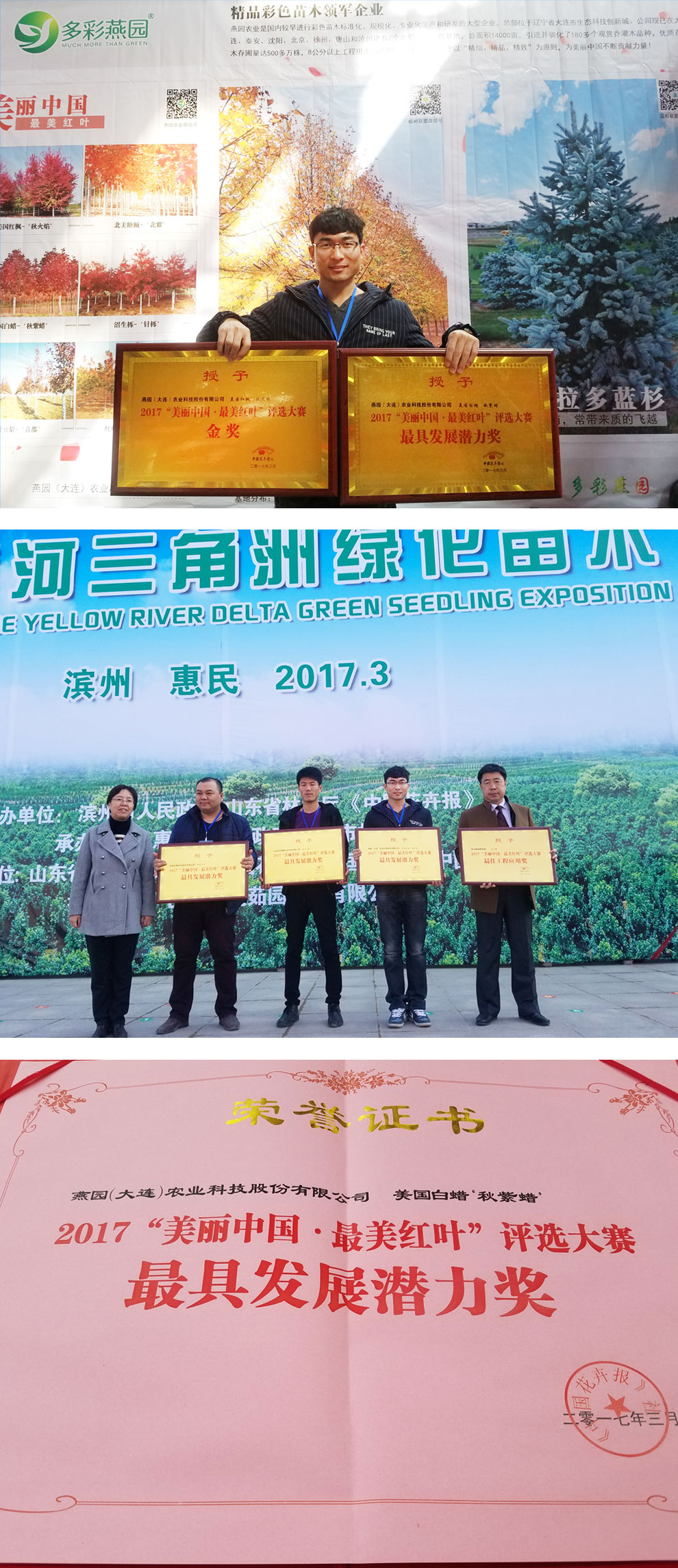 TXVLOG糖心官网版APP污农业主打产品“美国红枫-秋火焰”获2017“美丽中国·最美红叶”评选大赛金奖,“美国白蜡-秋紫蜡”获2017“美丽中国·最美红叶”评选大赛最具发展潜力奖。