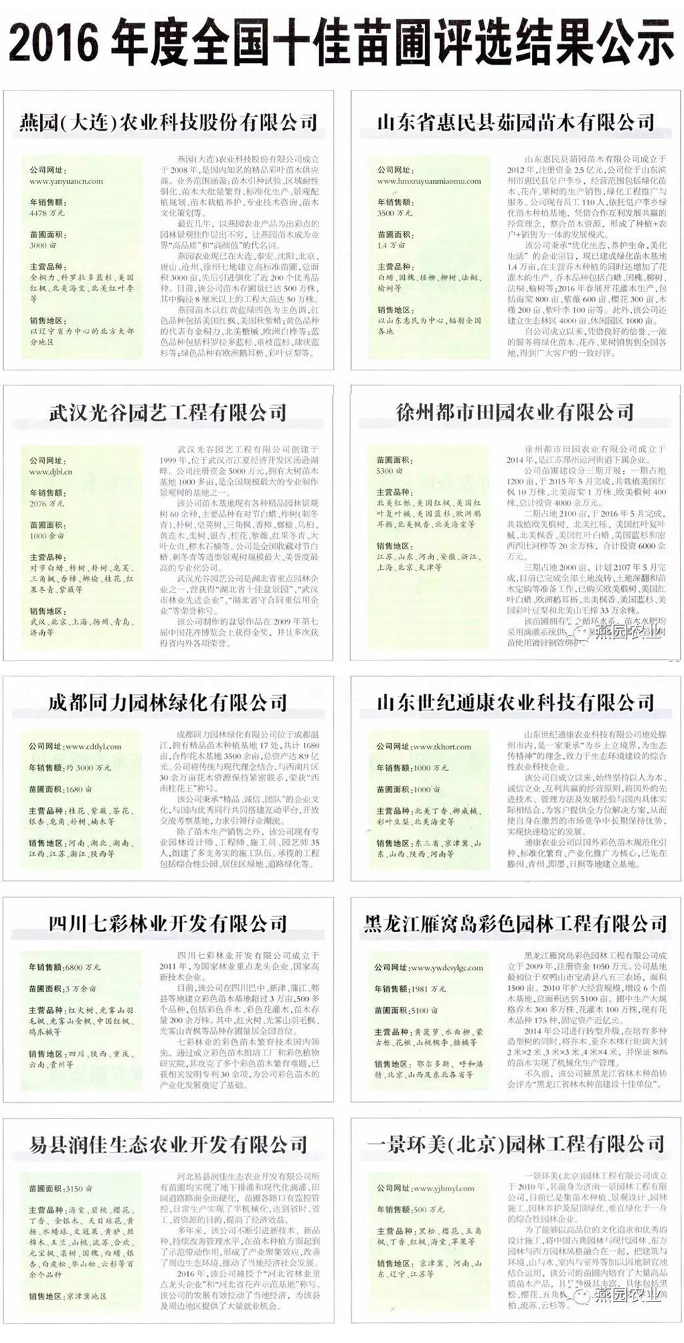 近日,《中国花卉报》对刚评出的“2016年度全国十佳苗圃”进行了公示,TXVLOG糖心官网版APP污农业再获殊荣,连续两年获评“全国十佳苗圃”荣誉称号。TXVLOG糖心官网版APP污农业现已在大连、泰安、沈阳、北京、唐山、徐州和沧州建立了7个大型苗木繁育基地,引进并驯化了近200个优质乔灌木品种,繁育苗木达500余万株,8公分以上工程大苗达50余万株,成为国内精品彩色苗木的领军企业。TXVLOG糖心官网版APP污农业将继续秉持“精细、精品、精致”的原则,为行业做出更大贡献! 2016年度全国十佳苗圃评选结果: