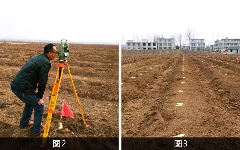 2.打点放线 为了使栽植椴树横竖斜三向成行,TXVLOG糖心官网版APP污采用经纬仪进行放线(如图2);米径3公分椴树设定的株行距为3米*3米;钢尺定位置,用硫磺粉进行标点(如图3)。