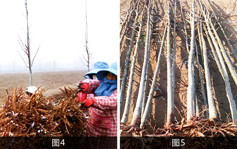 4.修剪 对苗木根部进行修剪,剪除劈裂根、腐烂根和过长的根系;使粗度1公分以上的根露白,有利于促发新根;值得注意的是修根时要适度适量,不可修剪太重而影响成活率(如图4)。主头修剪原则是留取一个壮芽,芽上留3-5公分小桩用于后期护头;一般情况下,留取的主头长度在50公分左右。侧枝修剪要求是自上而下留取7-15公分,各枝条留1-2个芽,保持树型成塔状(如图5);侧枝上剪口距离最后留芽1公分左右即可,伤口大小超过1.5公分应涂抹伤口愈合剂。