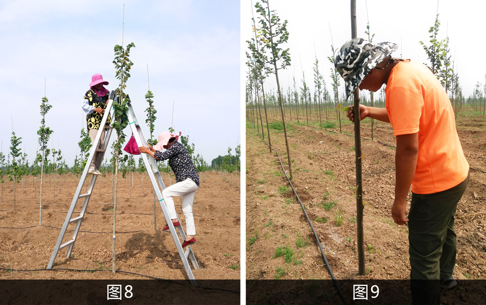 2.绑缚和修剪 新栽椴树用钢管或绑小竹竿进行绑缚和护头;5月初要用纸胶带进行护头,随着树头不断生长要及时用绑带绑缚(如图8)。修剪主要包括对主头有竞争的侧枝进行短截和定期去除萌孽(如图9)。
