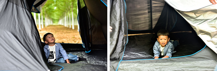 左:小苹果在槭树隧道开心的奔跑 右:“搭帐篷我也可以出一份力”