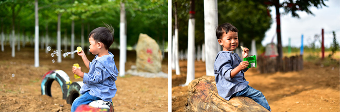 左:在大自然中吹泡泡 右:在大自然中吃饼干