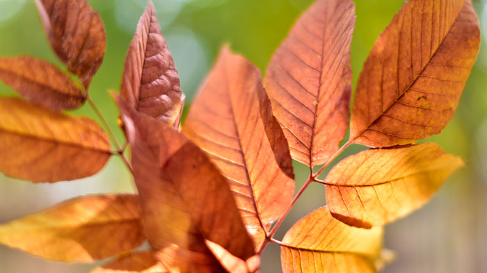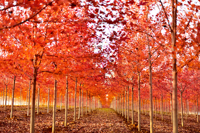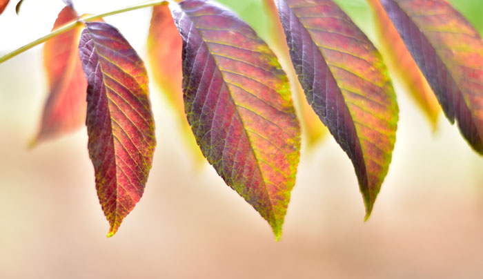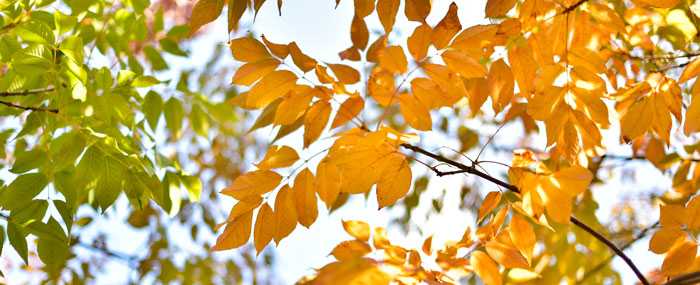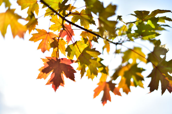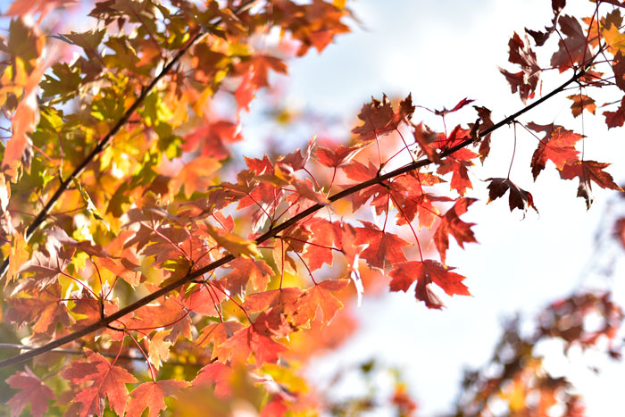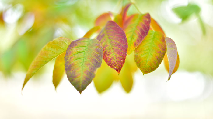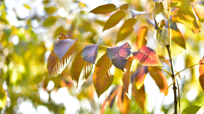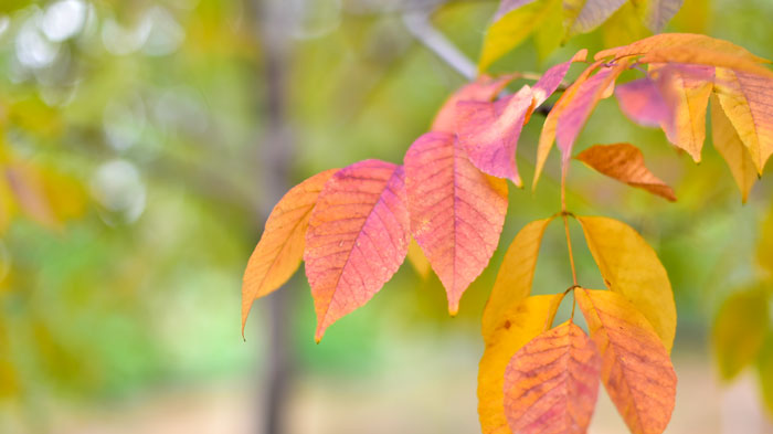 随着气温的变化,昼夜温差越来越大,叶片内的叶绿素逐渐褪去,而叶红素、叶黄素留存下来,使得绿叶变彩叶,温差越大,叶绿素流失越多,叶红素、叶黄素浓度越高,叶片色彩也就越鲜艳。因此,秋叶的色彩,时时刻刻都在变化。