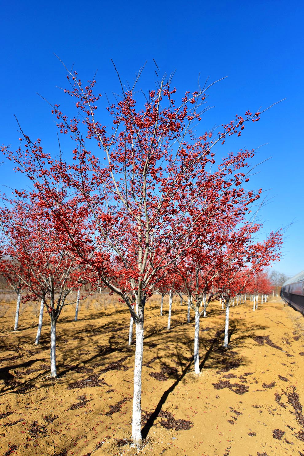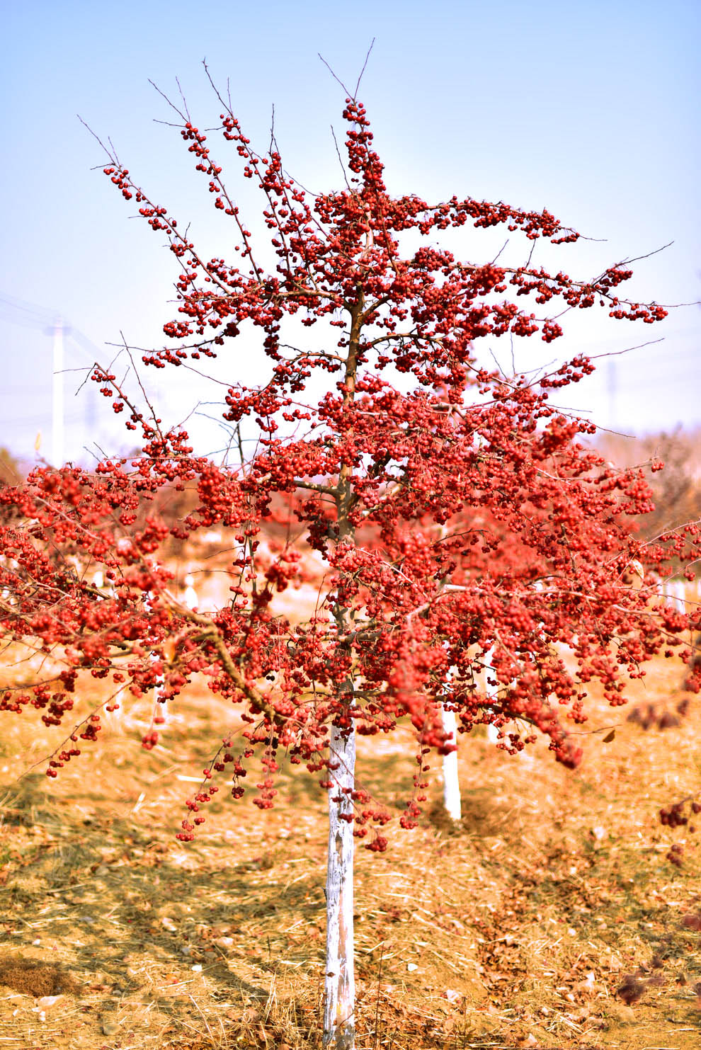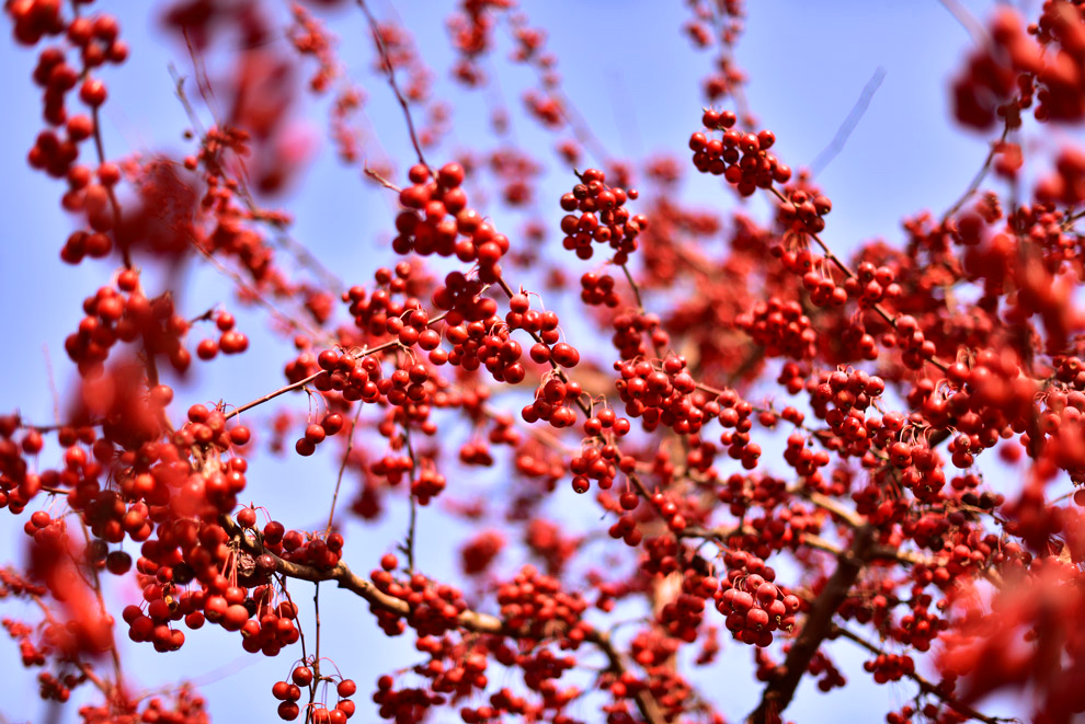 ‘冬艳’之所以叫冬艳,因其冬季颜色十分艳丽,无论是晴天还是阴天,冬艳的果实都红的纯粹,引人注目,是个不可多得的观花观果型树种。另外山楂树也象征着爱情和睦,有条件的新婚夫妇值得入手一棵‘冬艳’山楂树。