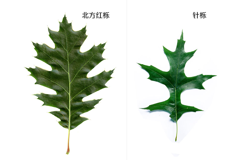 北方红栎:叶长12~24厘米,宽10~15厘米,叶缘具7~9浅裂;新叶粉红色,覆有柔软的白色绒毛,老叶光滑,深绿色,叶上面有光泽。
