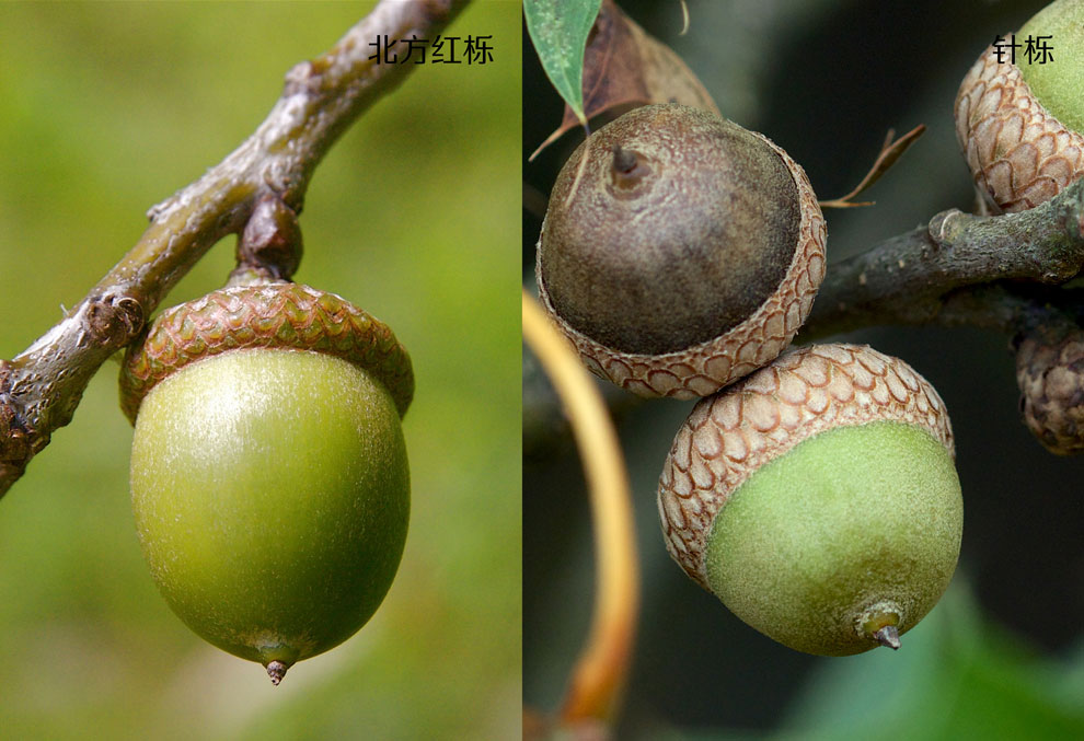 北方红栎:果实为橡子,被半球形壳斗包围,长1.5~3厘米,宽1~1.6厘米,幼时为绿色,成熟后变为棕褐色。壳斗宽2厘米,通常在果实底部覆盖,果实内核白色,味苦。