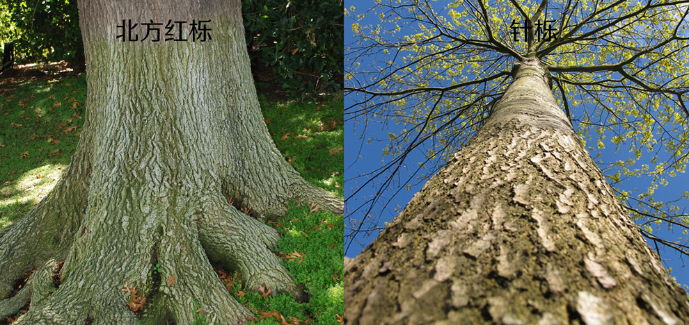 北方红栎:幼树树干浅灰色,光滑,老树树皮变成茶褐色,有鳞和宽脊,全树树干脊心处皆有亮纹。