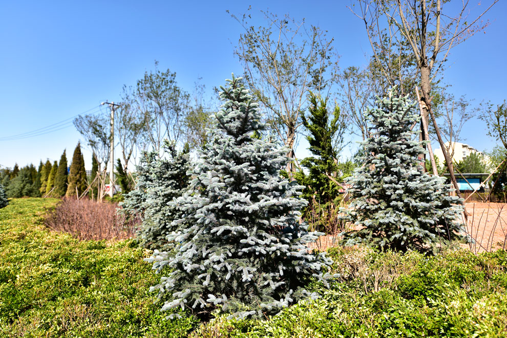 本工程二标段栽植科罗拉多蓝杉(株高2.5米,冠幅1.8米)共计99株,是目前国内科罗拉多蓝杉用量最大的一个工程项目,对科罗拉多蓝杉在国内的发展起到了奠基作用。以上照片中的蓝杉因是刚移栽的,所以并没有很好的表现出蓝杉的蓝色效果。
